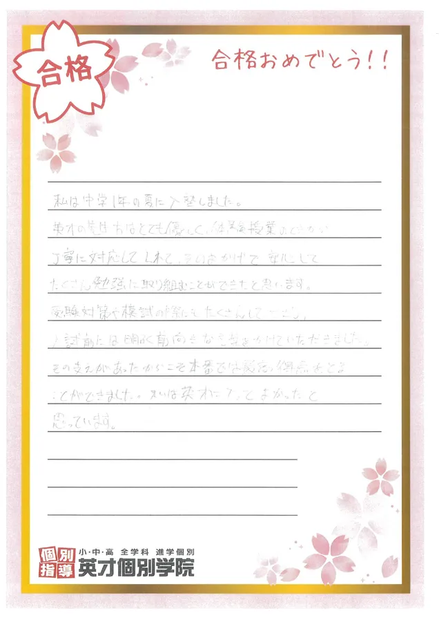 私は中学2年の夏に入塾しました。