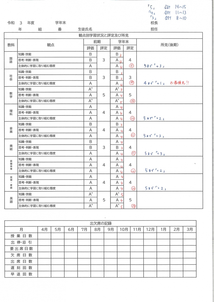 そして合計の数値によって内申が決まります。