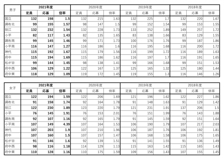 女子も倍率アップ、町田や駒場、調布北からの移動が想定されますが、調布北以外倍率アップしているためここでも都立回帰が見られます。