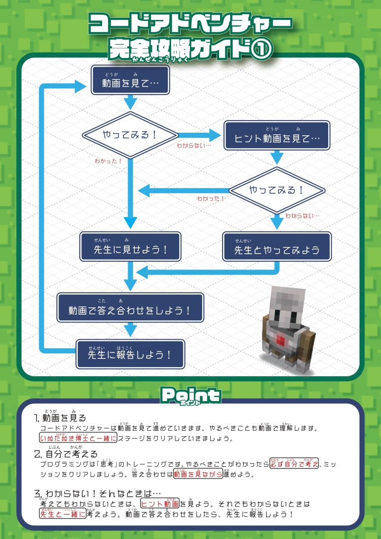 矢野口校のマインクラフトプログラミング「コードアドベンチャー」はエージェント君👇に色々なお願い事をしてステージをクリアしていきます。