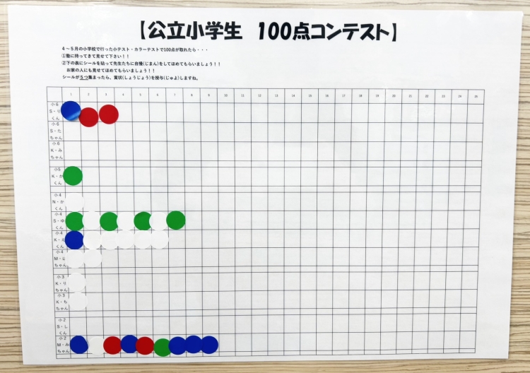 そのため、100点の答案を塾に持ってきてくれたら、シールでカウント。