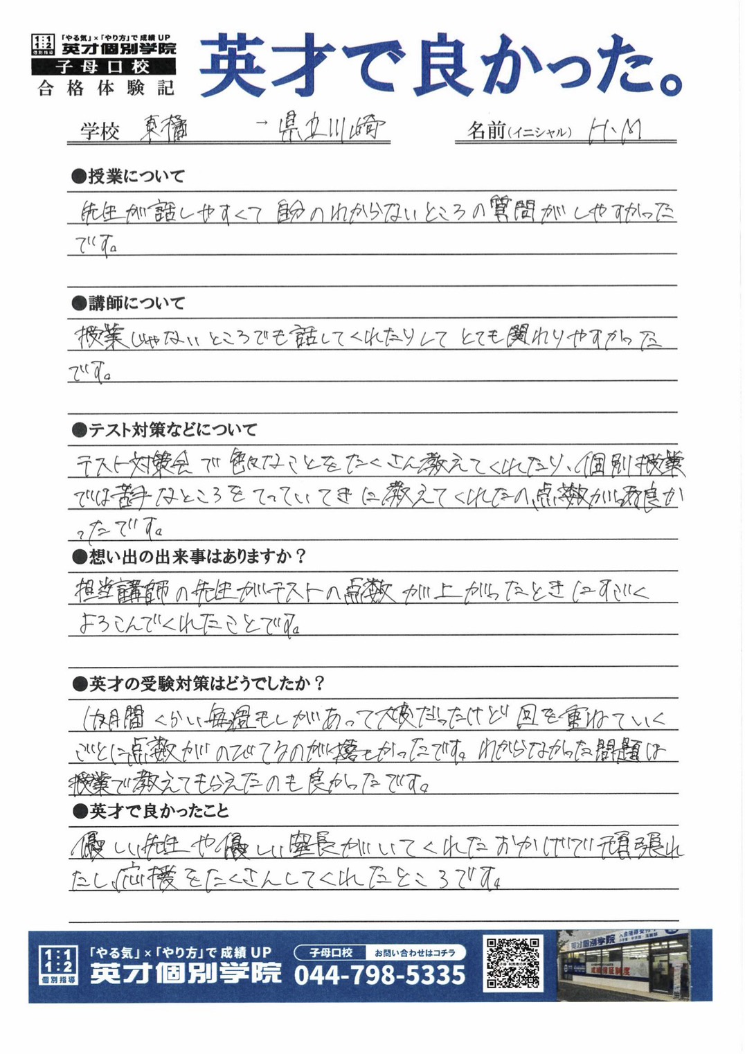英才個別学院 子母口校で受験を送った生徒に感想を聞きました。