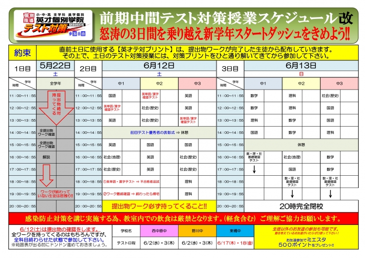 大好評!無料のテスト対策授業も再告知いたします!