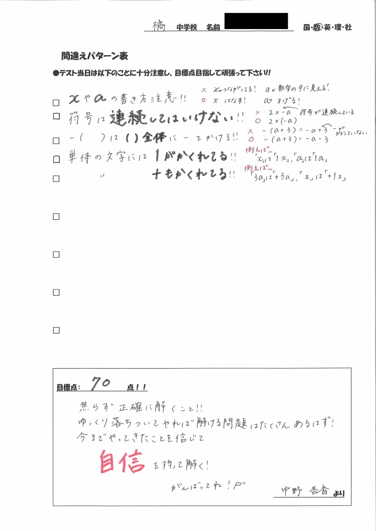 テスト前に【間違えパターン表】という名の資料を担当講師が生徒一人ひとり