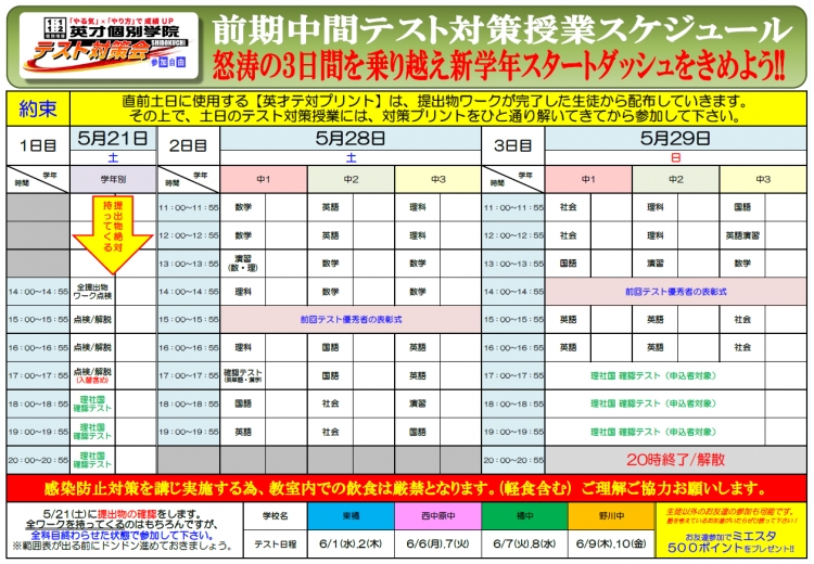 英才個別学院では総力を挙げ、テスト対策会リニューアル開催をしております!