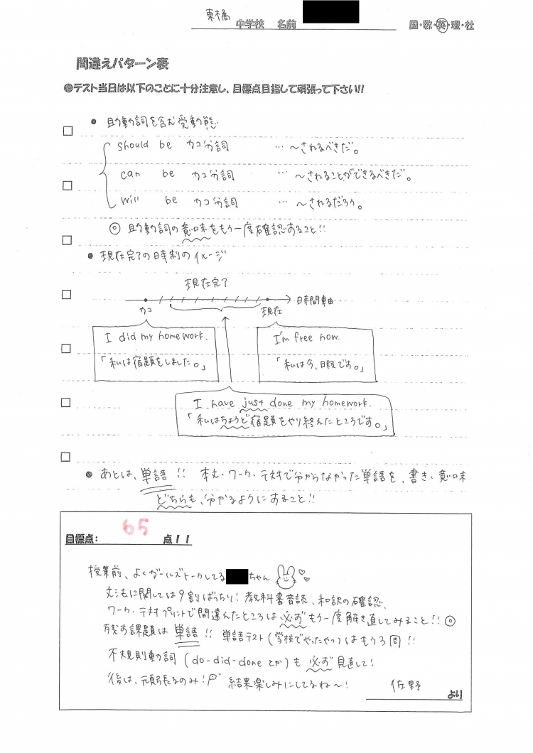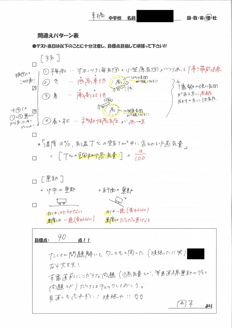 テスト前に【間違えパターン表】という名の資料を担当講師が生徒一人ひとり