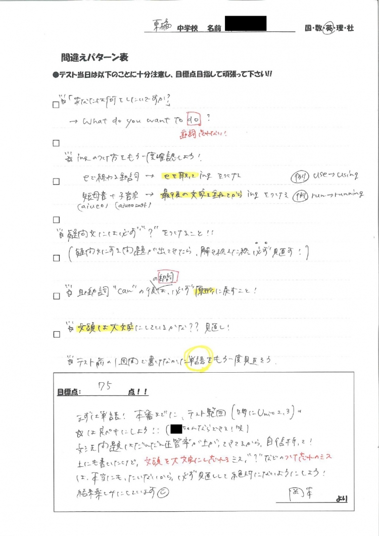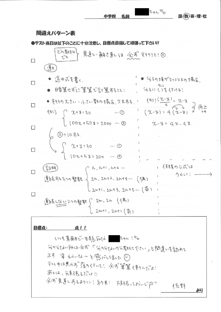 生徒想いNo.1の佐野先生が、中2Kさんに配布した資料です