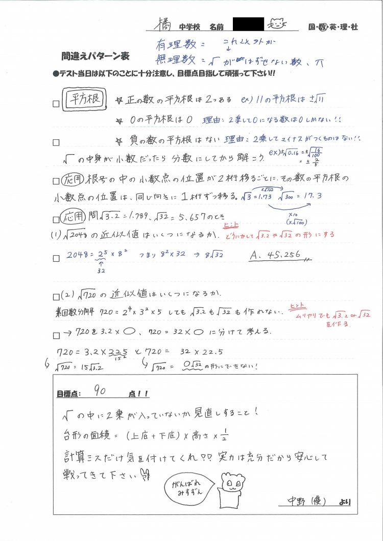 そしてこちらは熱心な指導が印象的な中野優子先生が、中3Yさんに配布した資料です