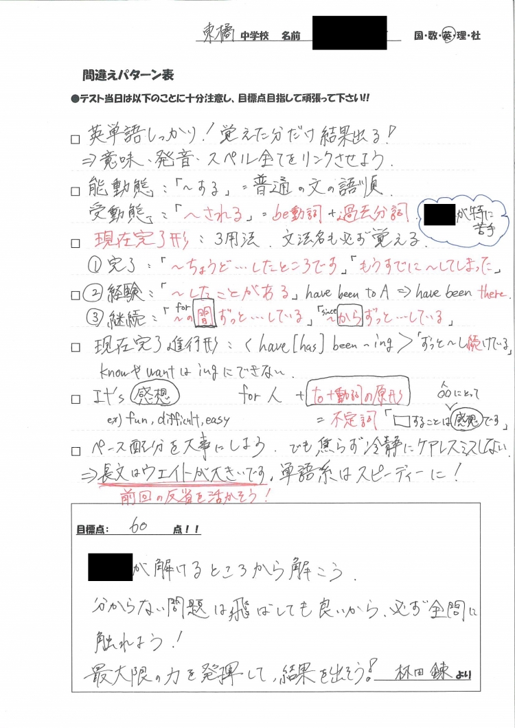 これをテスト前日やテスト当日または直前の確認してもらっています