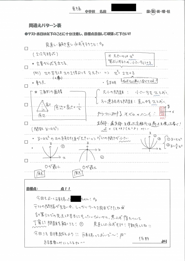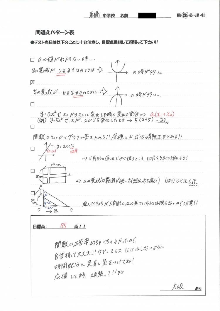 テスト前に【間違えパターン表】という名の資料を担当講師が生徒一人ひとり