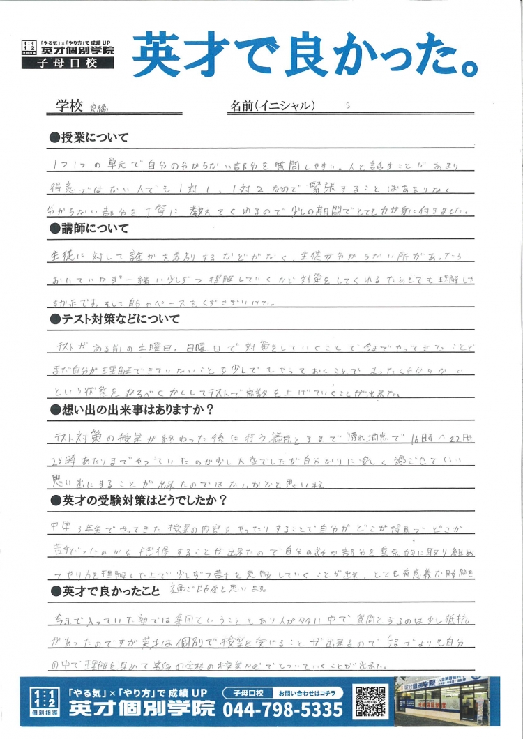 英才個別学院 子母口校で入試を送った生徒に感想を聞きました。
