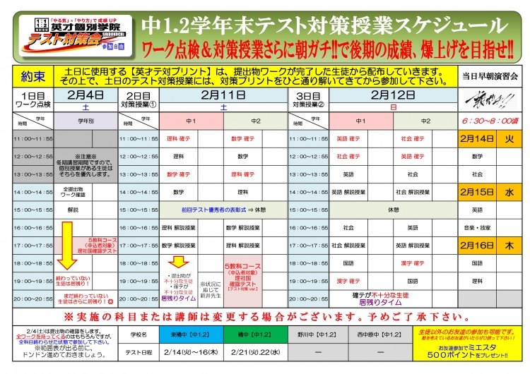 本日より中学生の学年末テストに向けた対策会の第1弾として
