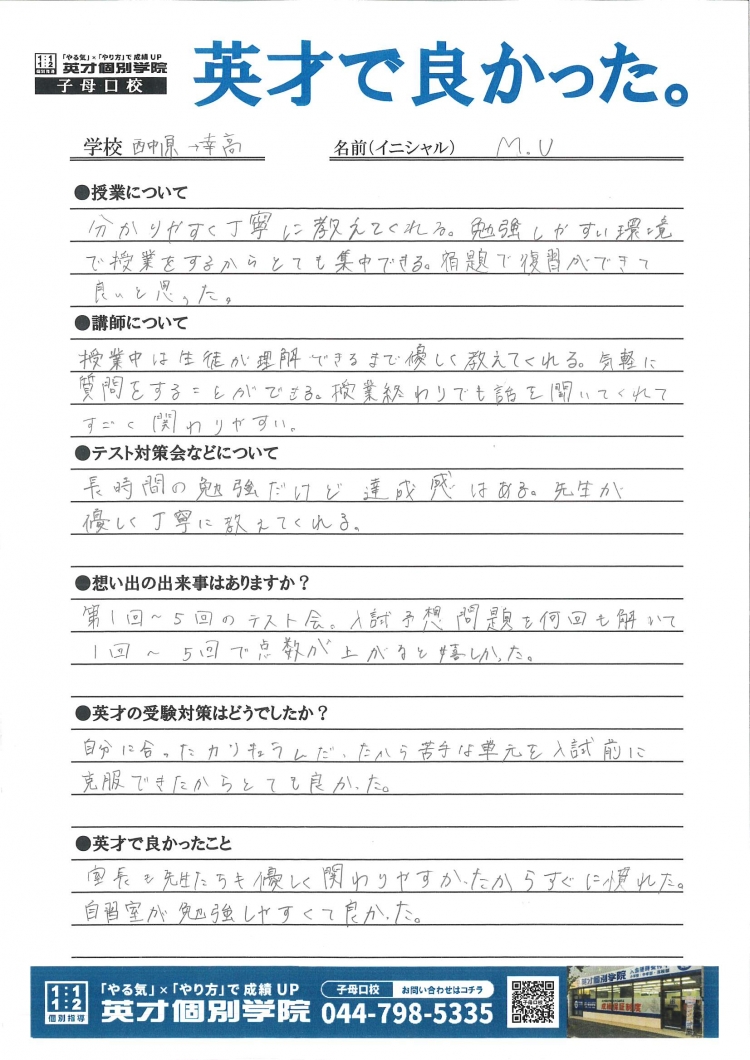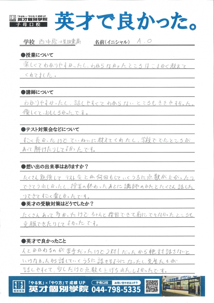 英才個別学院 子母口校で入試を送った生徒に感想を聞きましたので