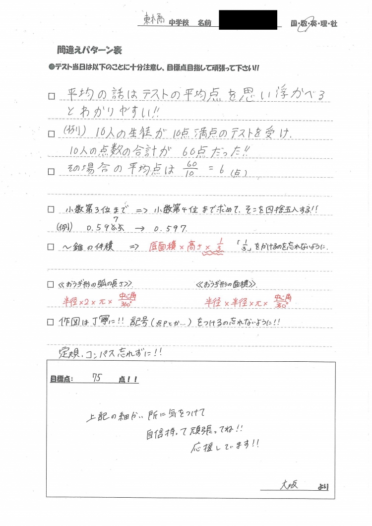 これをテスト前日やテスト当日または直前の確認してもらっています