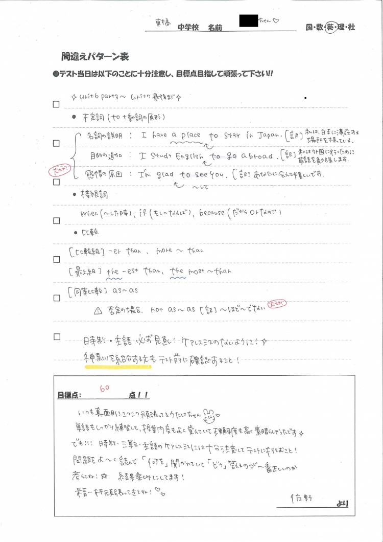 テスト前に【間違えパターン表】という名の資料を担当講師が生徒一人ひとり