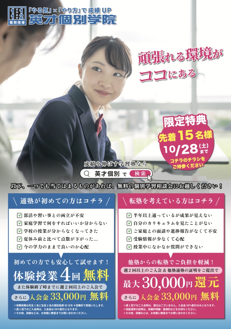 ・今通っている塾から移られる方へ→授業料最大3万円分還元+入会金無料