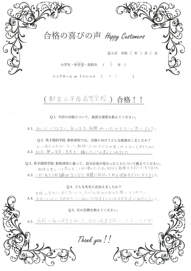 A.Yさん、小平西高校合格本当におめでとうございました!!