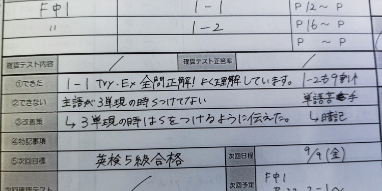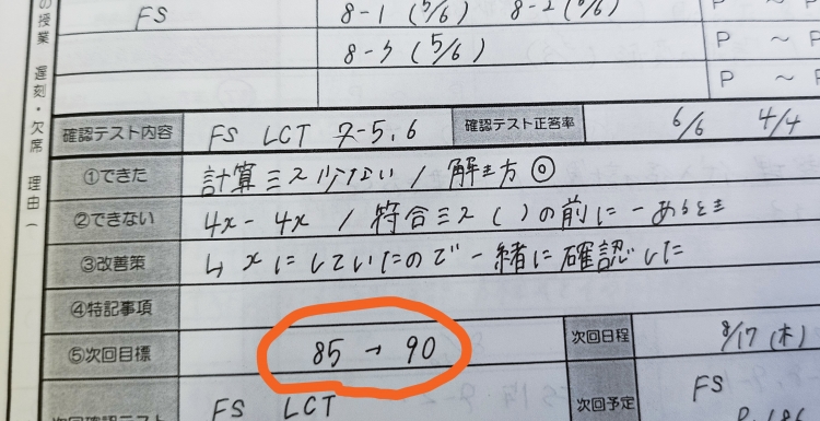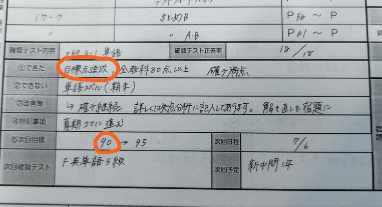 先生とご本人と一緒に相談して、2学期中間テストでの目標を90点としました。