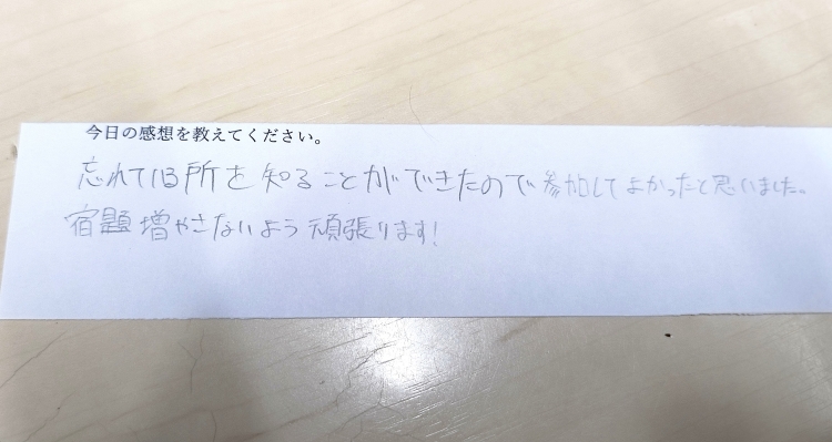 忘れている所を知ることができたので参加してよかったと思いました。