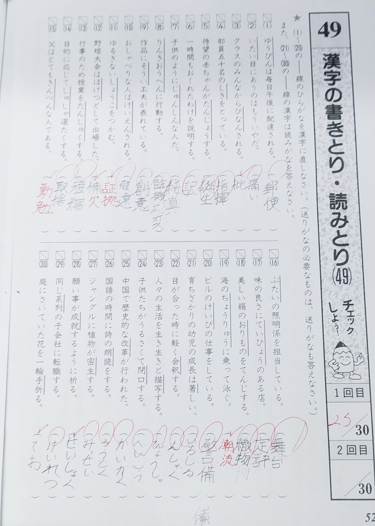 こちらは生徒さんの漢字テスト。