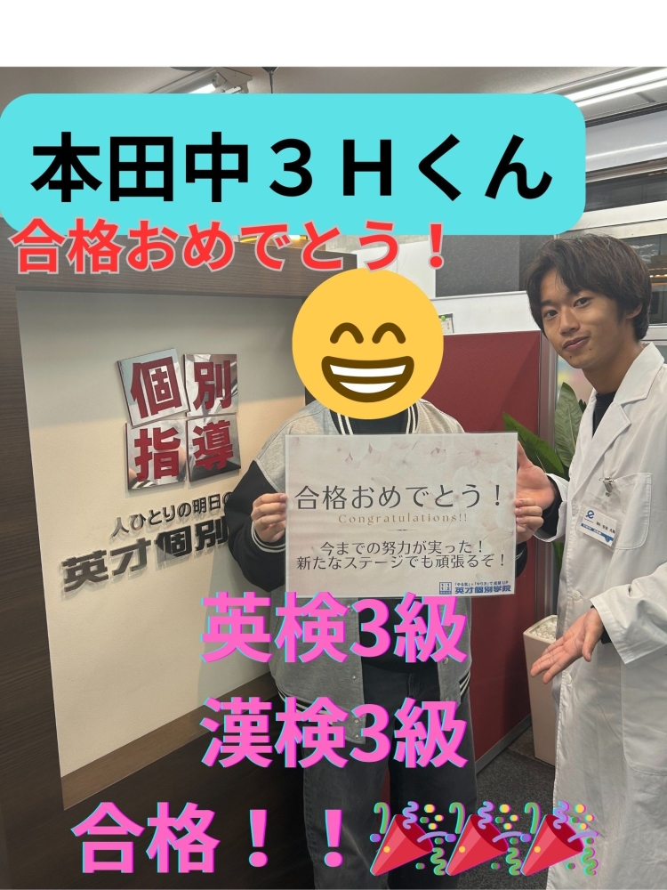 【本田中3年】英検漢検3級合格!!!