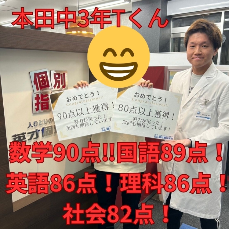 【本田中3年】数学90点‼国語89点!英語86点!理科86点!社会82点!