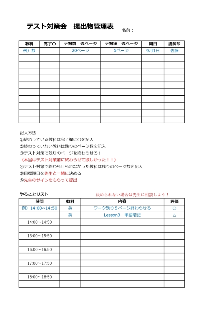 「どこまで進んでいるか」「どこまで仕上げる必要があるか」を確認し、テスト日までの計画を立てます。