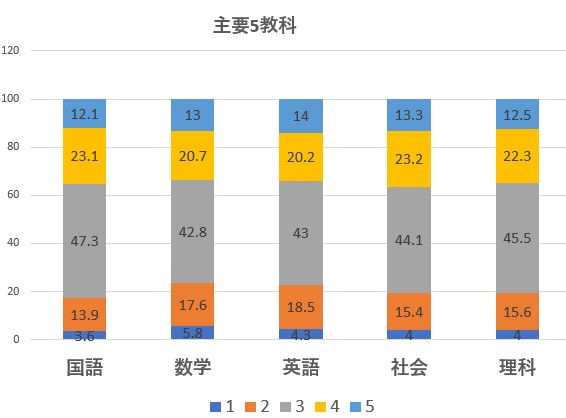 主要5教科別に各成績の割合を見ていきましょう。