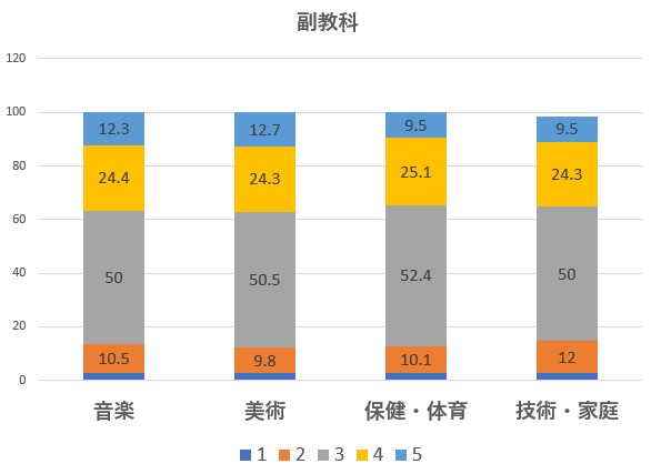 数学と英語は成績が厳しくつけられているようですが、それでも「2」以下の割合は20%強です。