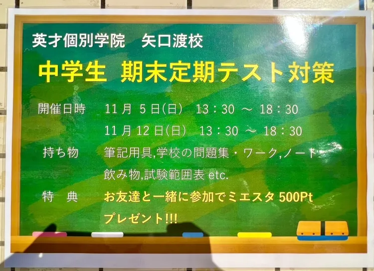 提出物の評価でAが取れるように指示を出します。11/5学校のワークを全て終わらせてテスト対策に参加してください。また、専用のプリントを作成して目標点に合わせて演習させる予定です。